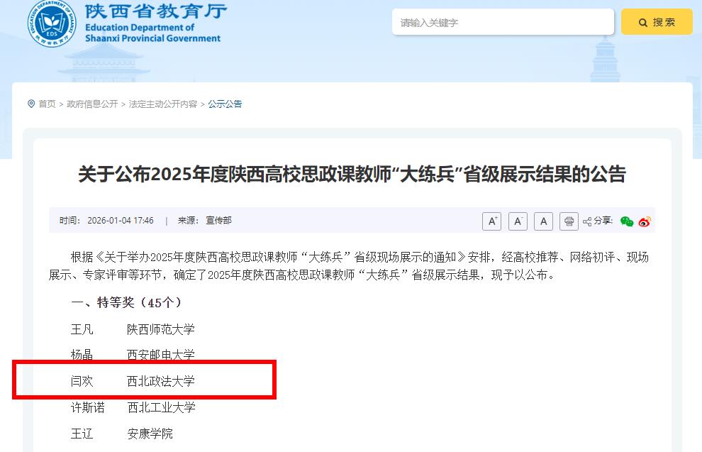 202614日,中共陕西省委教育工委、陕西省教育厅公布了2025年度陕西高校思政课教师“大练兵”省级展示结果,经高校推荐、网络初评、现场展示、专家评审等环节,皇冠现金网 闫欢老师获得特等奖。